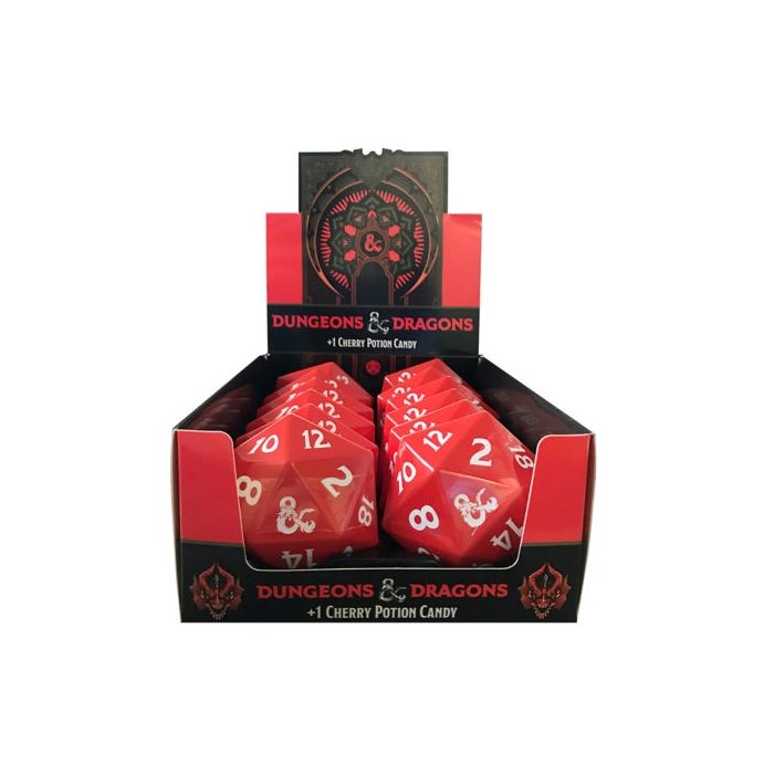 The 20-sided dice from the iconic role-playing game holds 1.2 ounces of cherry sour potion bottles. Packed 12 per display.