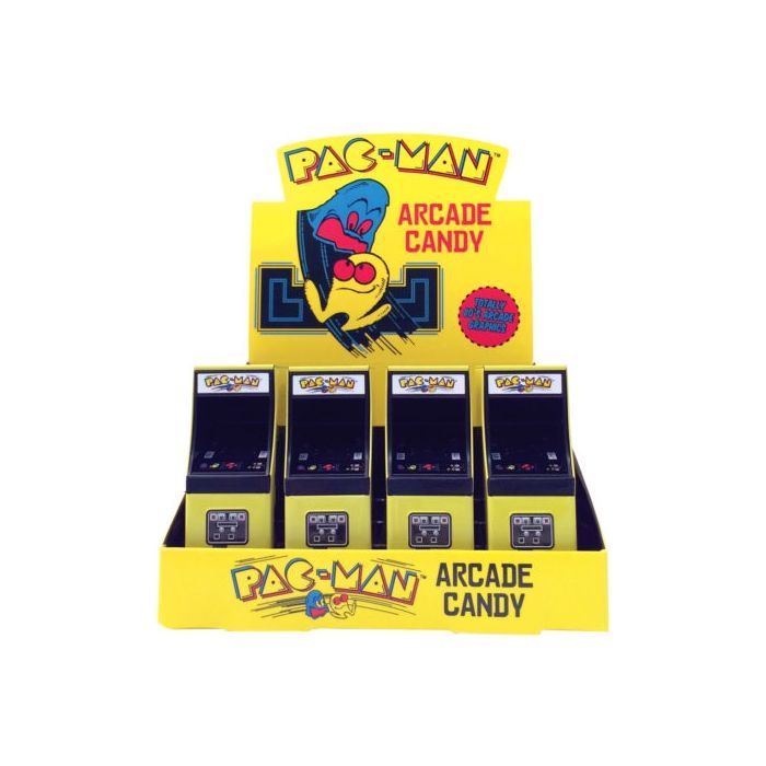The official 80s arcade graphics! Each tin is shaped like the arcade cabinet and holds 0.6 ounces of strawberry flavored Pac-Man shaped candies. Packed 12 per display.