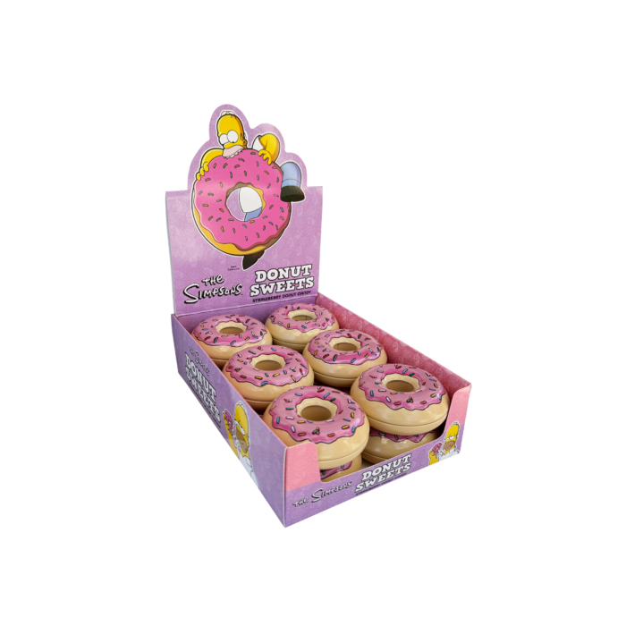 A tin in the shape of Homer Simpson's iconic pink frosted donut, it will last longer than the real one! Filled with 1.5oz of strawberry donut flavored candy donuts! Get your dozen, packed 12 per display.